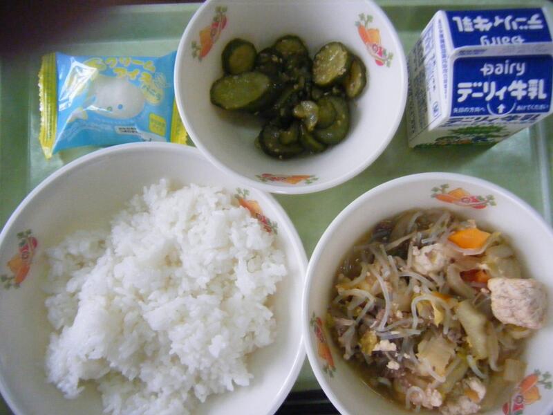 今日の給食のメニューは、すき焼き、たたききゅうり、もちクリームアイス、白ご飯(ミルキークイーン)、牛乳でした。