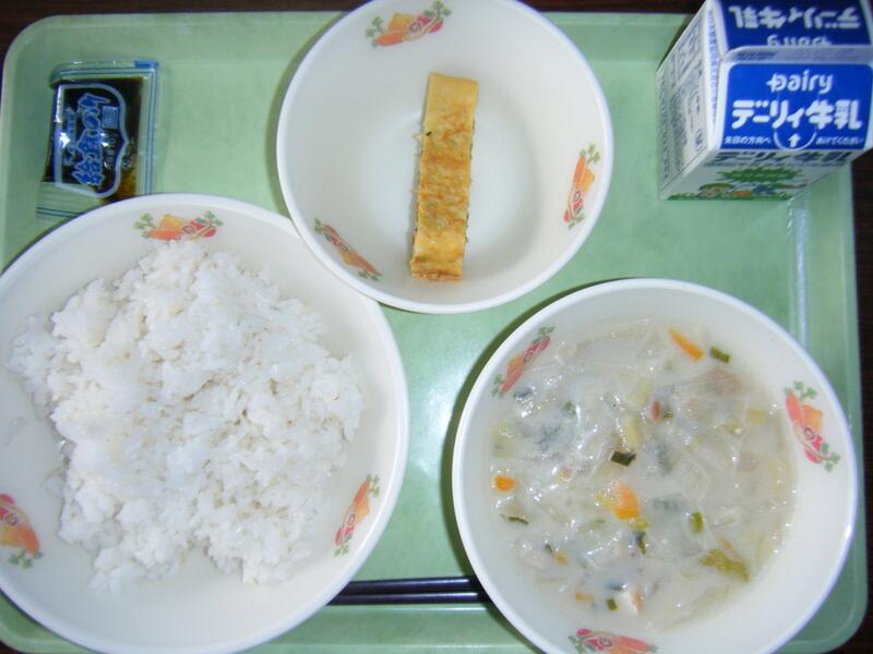 今日の給食のメニューは、すり身汁、キムタクご飯の具、、麦ごはん、牛乳でした。