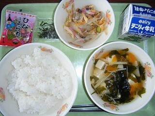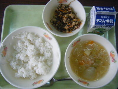 今日の給食のメニューは、冬瓜のすまし汁、ひじきの炒り煮、ふりかけ、麦ご飯、牛乳でした。