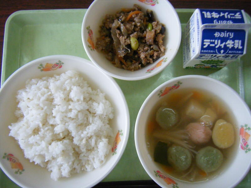 今日の給食のメニューは、つみれ汁、マーボーなす、麦ご飯、牛乳でした。