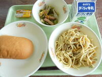 今日の給食のメニューは、ズッキーニのスパゲティー、ツナソテー、減量コッペパン、牛乳でした。