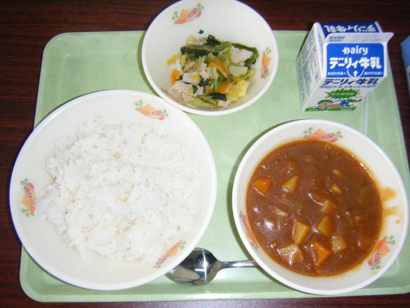 今日の給食のメニューは、ポークカレー、小松菜のソテー、麦ご飯、牛乳でした。