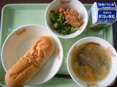今日の給食のメニューは、春雨スープ、からあげ、ゆでブロッコリー、米粉パン、牛乳でした。