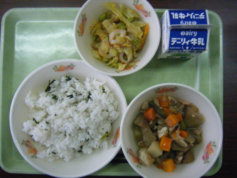 今日の給食のメニューは、けんちん汁、キムタクご飯の具、麦ご飯、牛乳でした。