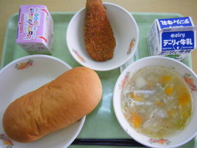 今日の給食のメニューは、ビーンズスープ、日向鶏コロッケ、コッペパン、牛乳でした。