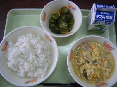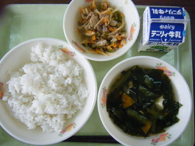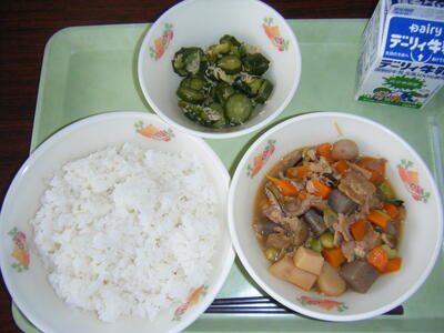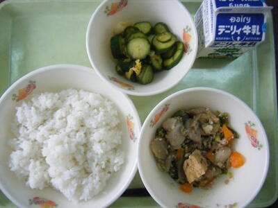 今日の給食のメニューは、水田ごぼうのうま煮、きゅうりのトウバンジャン炒め、麦ごはん、牛乳でした。