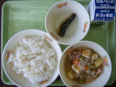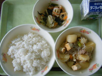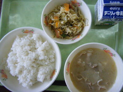 今日のメニューは、豚汁、千切り大根と昆布の炒め物、麦ご飯、牛乳でした。