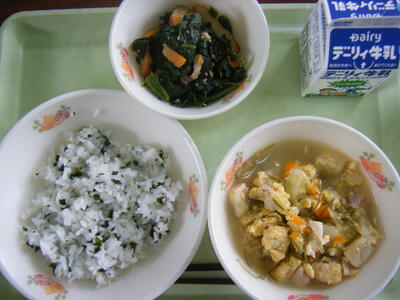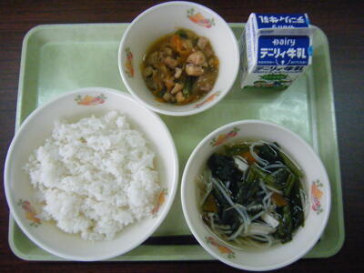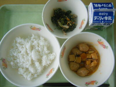 今日(4月18日)の給食のメニューは、厚揚げのそぼろ煮、おかか炒め、麦ご飯、牛乳でした。