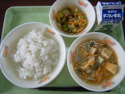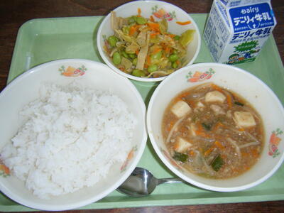 今日の給食のメニューは、マーボー豆腐、もやしとハムの炒め物、麦ご飯、牛乳でした。