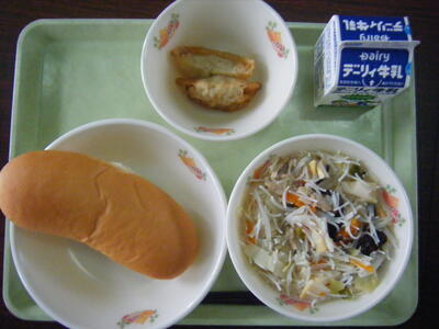 今日の給食のメニューは、汁ビーフン、揚げ餃子、減量コッペパン、牛乳でした。