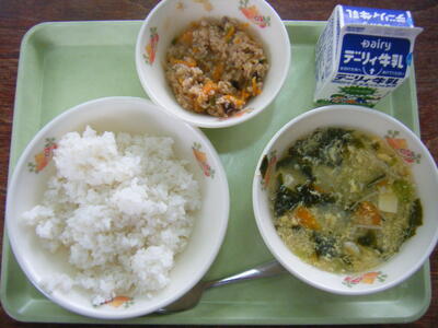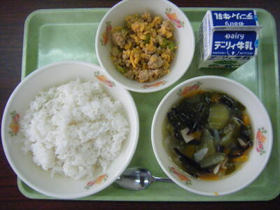 今日の給食のメニューは、かきたま汁、肉みそ丼の具、麦ご飯、牛乳でした。