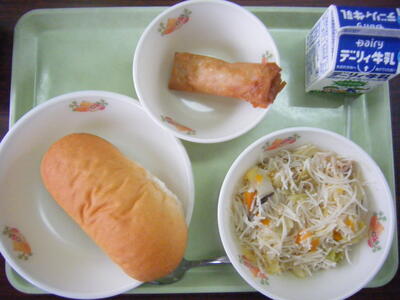 今日の給食のメニューは、五目ビーフン、春巻き、減量コッペパン、牛乳でした。