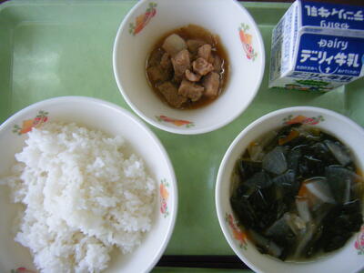 今日の給食のメニューは、わかめスープ、チンジャオロース、麦ご飯、牛乳でした。