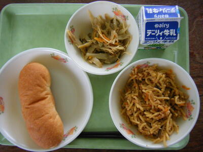 今日の給食のメニューは、タイピーエン、ごぼうのマヨソテー、減量米粉パン、牛乳でした。