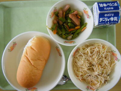 今日の給食のメニューは、和風スパゲティー、アスパラガスのソテー、はちみつ&マーガリン、減量コッペパン、牛乳でした。