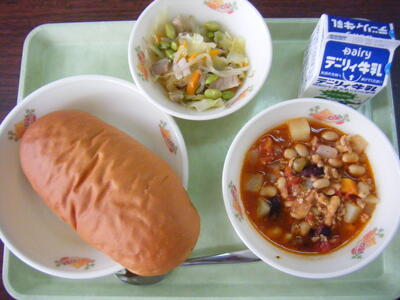 今日の給食のメニューは、ポークビーンズ、キャベツのソテー、黒糖パン、牛乳でした。