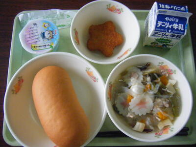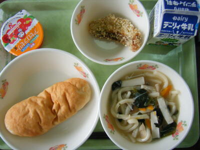今日の給食のメニューは、山菜うどん、ちくわの磯部揚げ、減量米粉パン、牛乳でした。