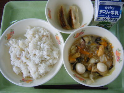 今日の給食のメニューは、八宝菜、ギョーザ、ギョーザのたれ、麦ごはん、牛乳でした。
