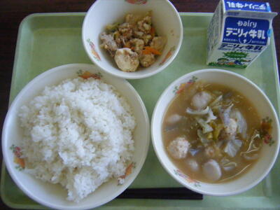 今日の給食のメニューは、桜島どりの肉団子スープ、豚肉のしょうが焼き、麦ごはん、牛乳でした。