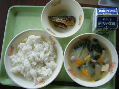 今日の給食のメニューは、豚汁、さばしょうが煮、麦ご飯、牛乳でした。