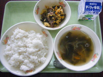 今日の給食のメニューは、わかめスープ、ビビンバ丼の具、麦ご飯、牛乳でした。