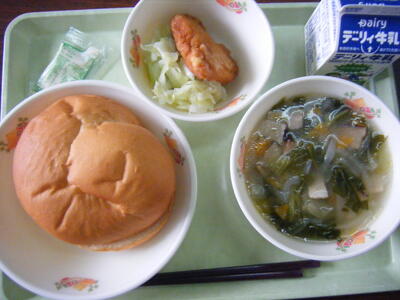 今日の給食のメニューは、チンゲンサイのスープ、チキン南蛮、ゆでキャベツ、タルタルソース、バーガーパン、牛乳でした。