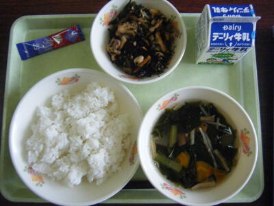 今日の給食のメニューは、なめこのみそ汁、ひじきの炒り煮、麦ご飯、牛乳でした。