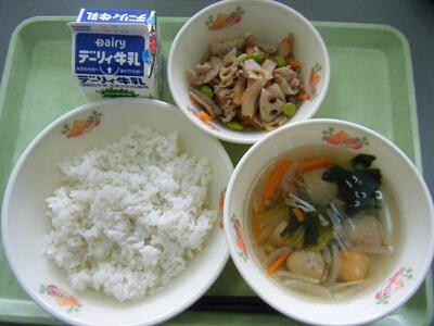 今日の給食は、麦ご飯、のっぺい汁、豚肉のみそ炒め、牛乳でした。
