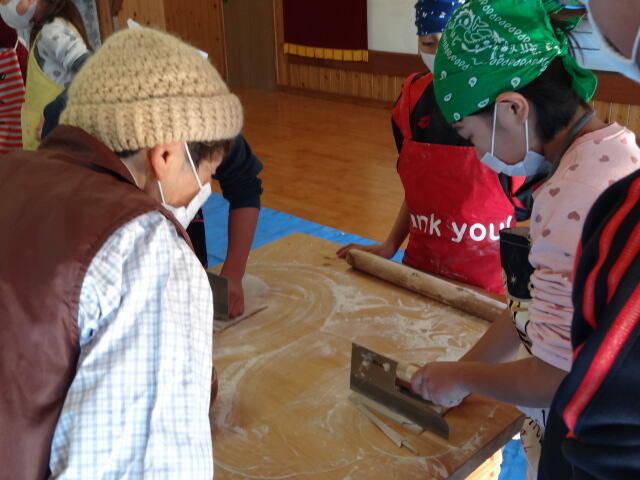 地域の老人クラブのみなさんに教えていただきながら、棒で伸ばして、包丁で切り、麺をゆでて、だし汁でいただきました。
