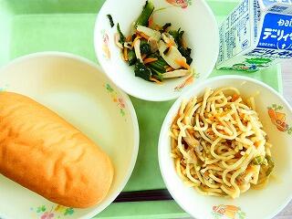 今日の給食のメニューは、和風スパゲティ、小松菜とベーコンのソテー、減量コッペパン、牛乳でした。