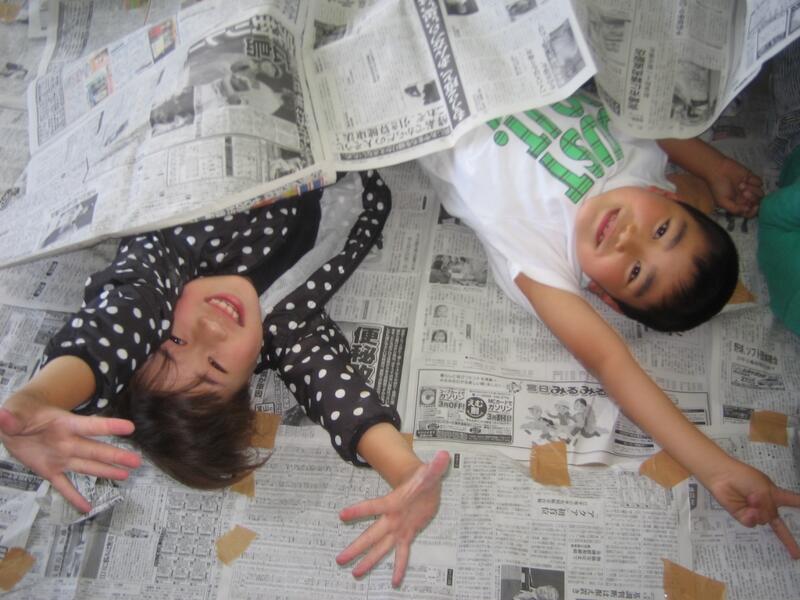 新聞紙をつなぎあわせて、大きなシートができました。子どもたちは、寝転んだり、くるまったり