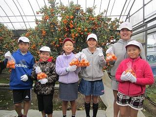 今日は、北方小学校の5年生と一緒に、キンカン生産農家さんのハウスへ、完熟きんかん「たまたま」を収穫に行きました。