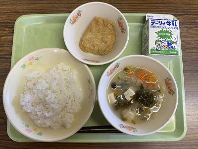 今日の給食のメニューは、厚揚げのみそ汁、千切り大根の炒め物、麦ご飯、牛乳でした。