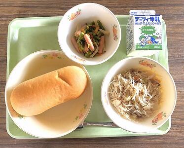今日の給食のメニューは、和風スパゲティ、小松菜とベーコンのソテー、減量コッペパン、牛乳でした。