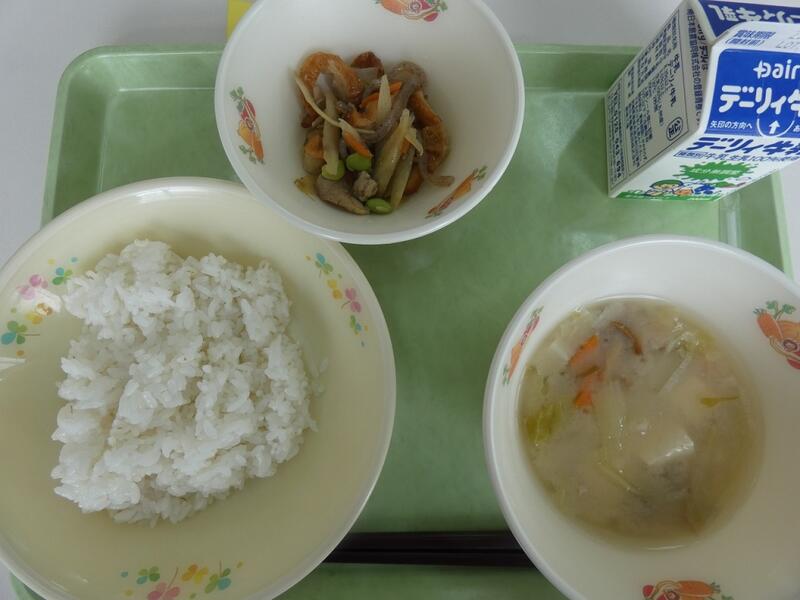 今日の給食のメニューは、なめこの味噌汁、ごぼうのきんぴら、麦ご飯、牛乳でした。