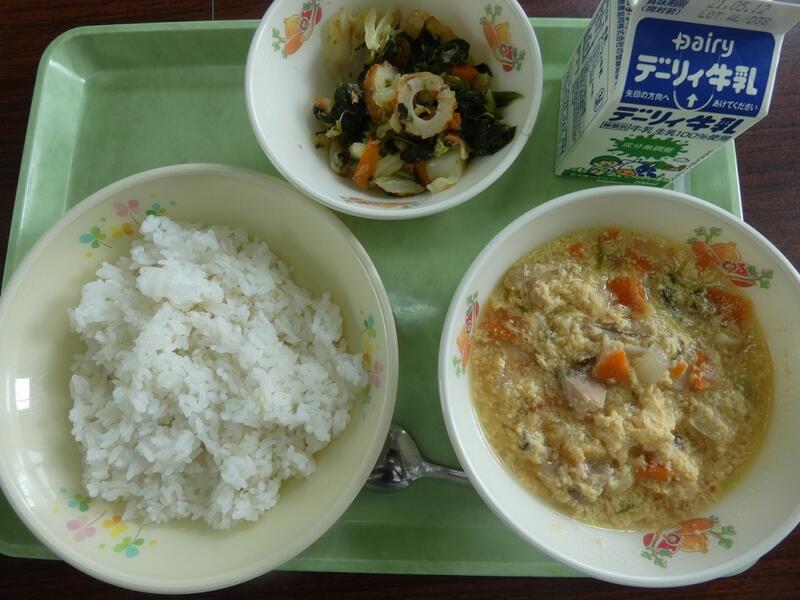 今日の給食のメニューは、魚そうめん汁、鶏肉の甘辛炒め、わかめご飯、牛乳です。