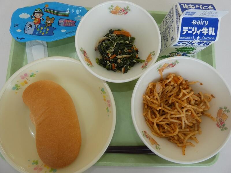 今日の給食のメニューは、ミートスパゲティー、ほうれん草とエリンギのソテー、こどもの日ゼリー、減量コッペパン、牛乳でした。