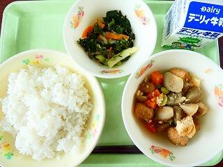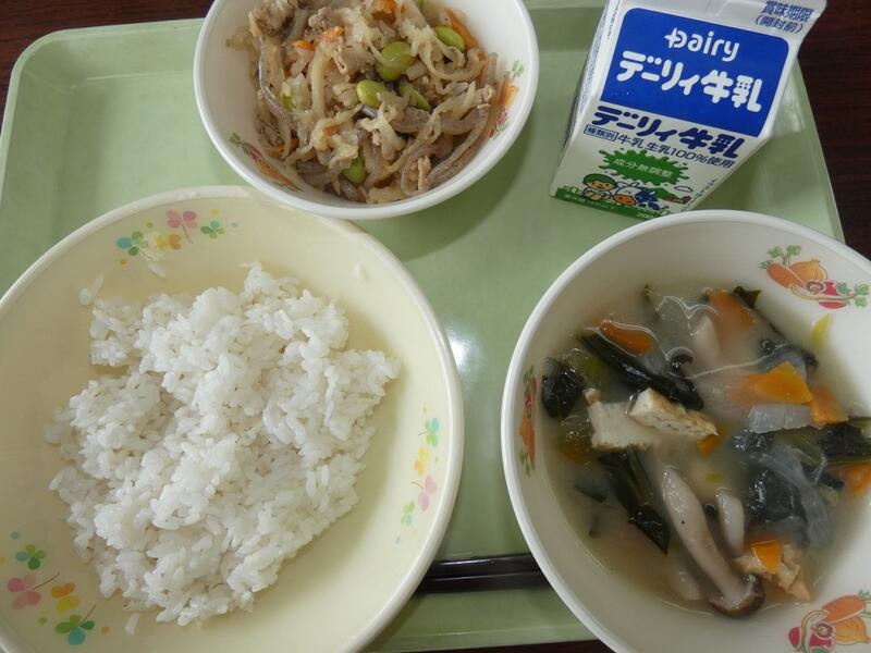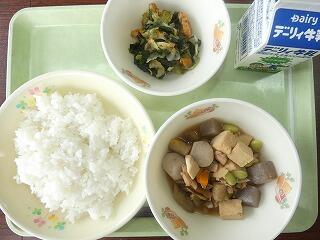 今日の給食のメニューは、鶏肉と水田ごぼうのうま煮、いそか炒め、白ご飯、牛乳です。