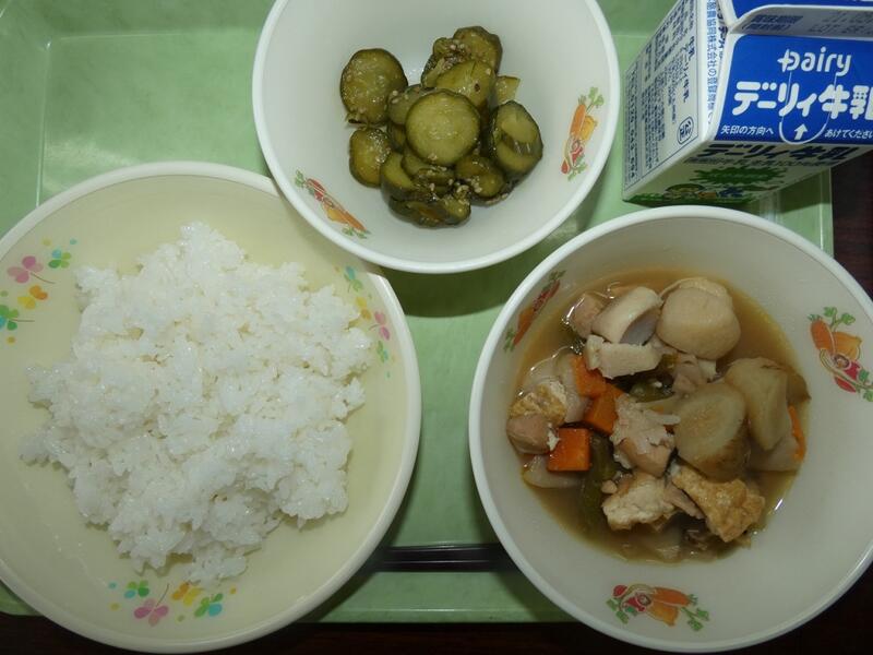 今日の給食のメニューは、筑前煮、きゅうりの炒め物、白ご飯(ミルキークイーン)、牛乳でした。