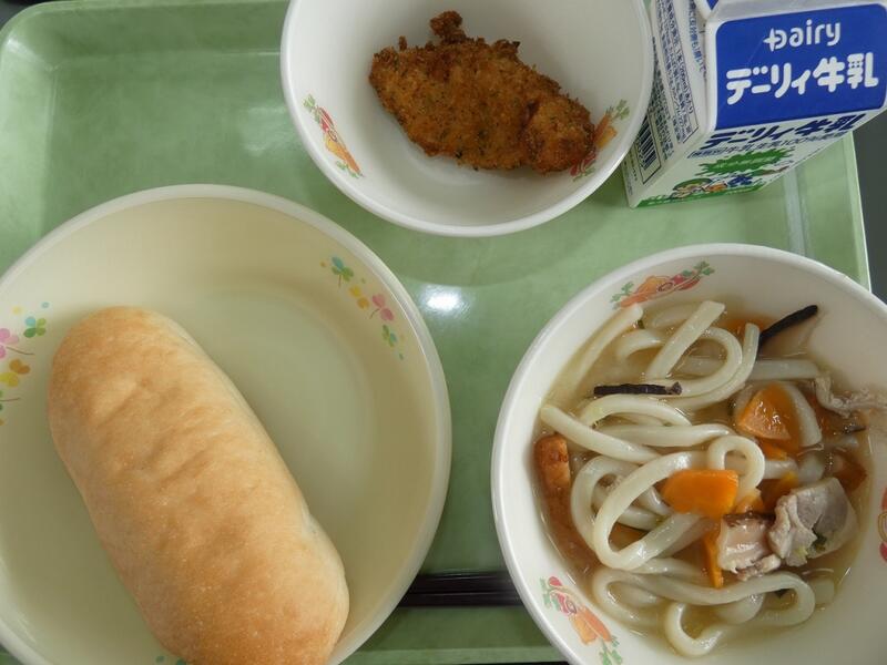今日の給食のメニューは、五目うどん、ホキフライ、減量米粉パン、牛乳でした。