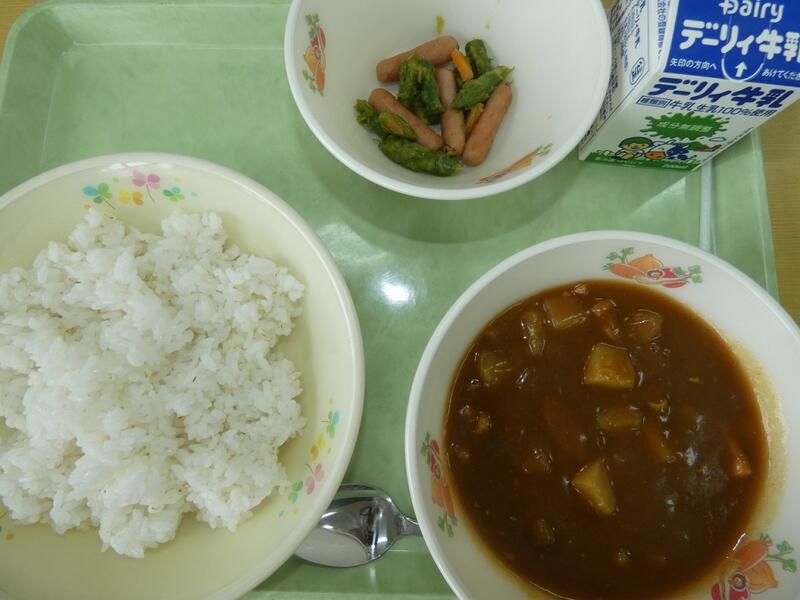 今日の給食は、チキンカレー、アスパラガスのソテー、麦ご飯、牛乳でした。