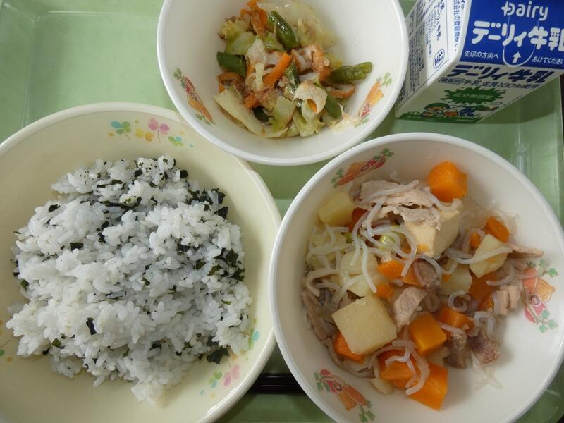 今日の給食のメニューは、肉じゃが、キャベツのおかか炒め、わかめご飯、牛乳でした。