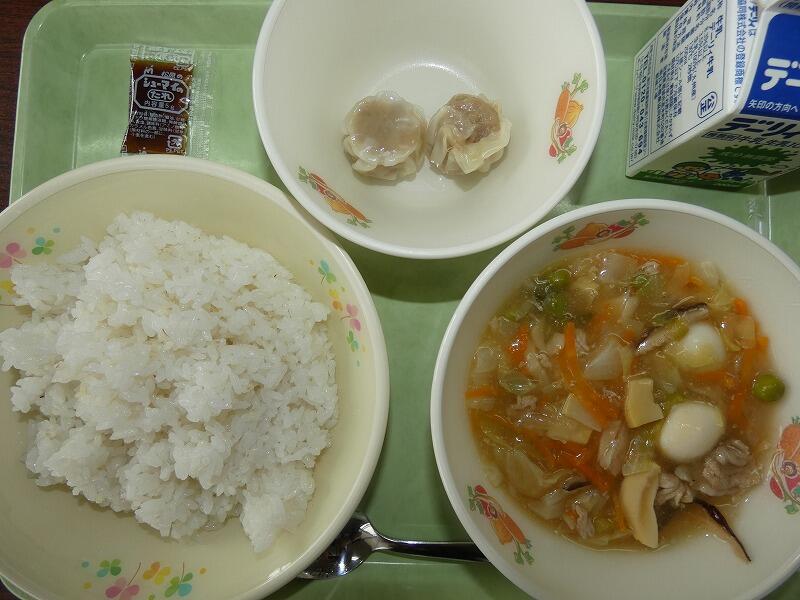 今日の給食のメニューは、中華丼、シューマイ、たれ、麦ご飯、牛乳でした。