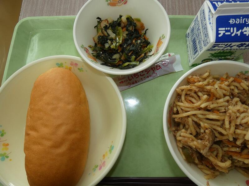 今日の給食のメニューは、小松菜のソテー、ジャージャー麺、焼きそば、減量コッペパン、牛乳でした。