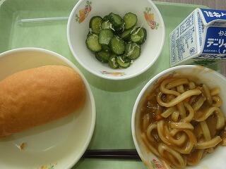 今日の給食のメニューは、カレーうどん、きゅうりのピリ辛炒め、減量コッペパン、牛乳でした。