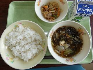 今日の給食のメニューは、もずくのスープ、ホイコーロー、麦ご飯、牛乳でした。