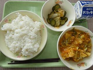今日の給食は、麦ごはん、マーボー豆腐、ささみの炒め物、牛乳でした。