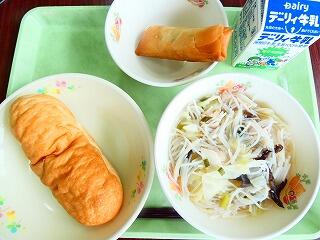今日の給食のメニューは、汁ビーフン、春巻き、減量米粉パン、牛乳でした。