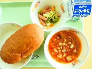 今日の給食のメニューは、ビーンズスープ、黒豚メンチカツ、コッペパン、牛乳でした。