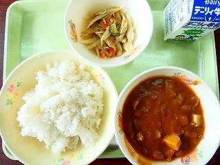 今日の給食のメニューは、ビーフカレー、ごぼうとささみのソテー、麦ご飯、牛乳でした。